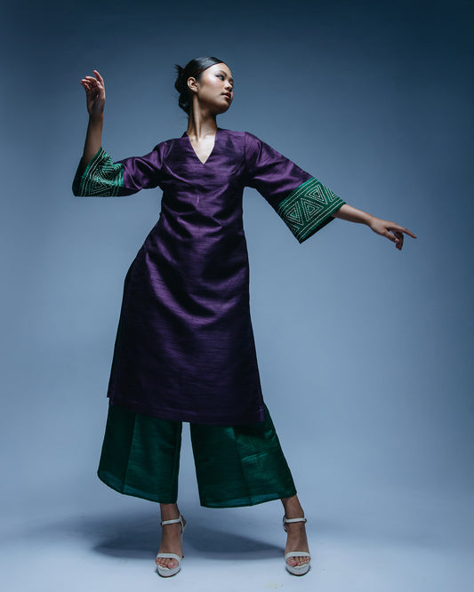 Wine Kurta With Embroidered Sleeves & Green Straight, Short, Above Ankle Pants