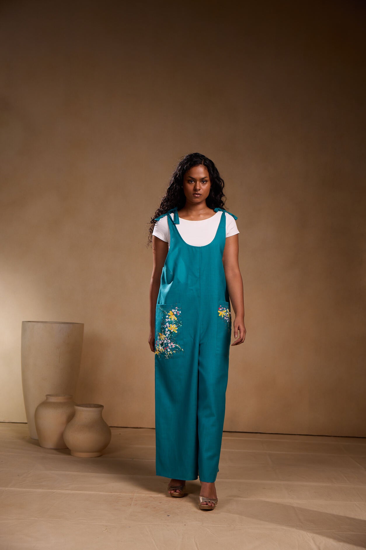 This jumpsuit is made of cotton blend fabrics which is extremely comfortable on your skin. Hand painted and embroidered with small beads.